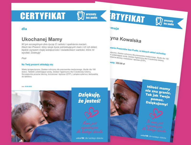 W podziękowaniu za przekazany potrzebującej mamie prezent możesz pobrać spersonalizowany certyfikat i wręczyć go swojej Mamie jako symbol dobra, którym dzielisz się w Jej imieniu.