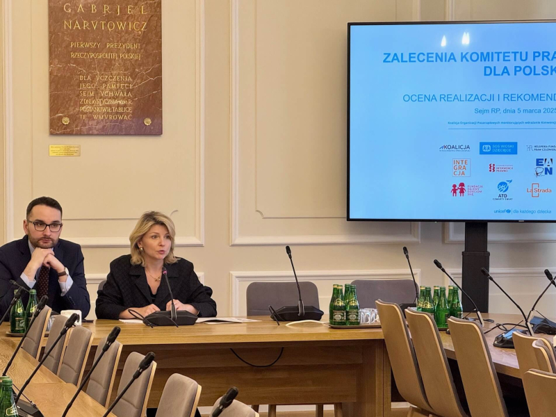 5 marca, podczas posiedzenia sejmowej Komisji ds. Dzieci i Młodzieży, przedstawicielki Koalicji Organizacji Pozarządowych monitorujących wdrażanie Konwencji o prawach dziecka w Polsce zaprezentowały wybrane kwestie z Raportu. Renata Szredzińska (Fundacja Dajemy Dzieciom Siłę) mówiła o przeciwdziałaniu przemocy wobec dzieci, Katarzyna Słubik (Stowarzyszenie Interwencji Prawnej) skupiła się na dzieciach z doświadczeniem uchodźczym, a Beata Kulig (Stowarzyszenie SOS Wioski Dziecięce w Polsce) na kwestii pieczy zastępczej.