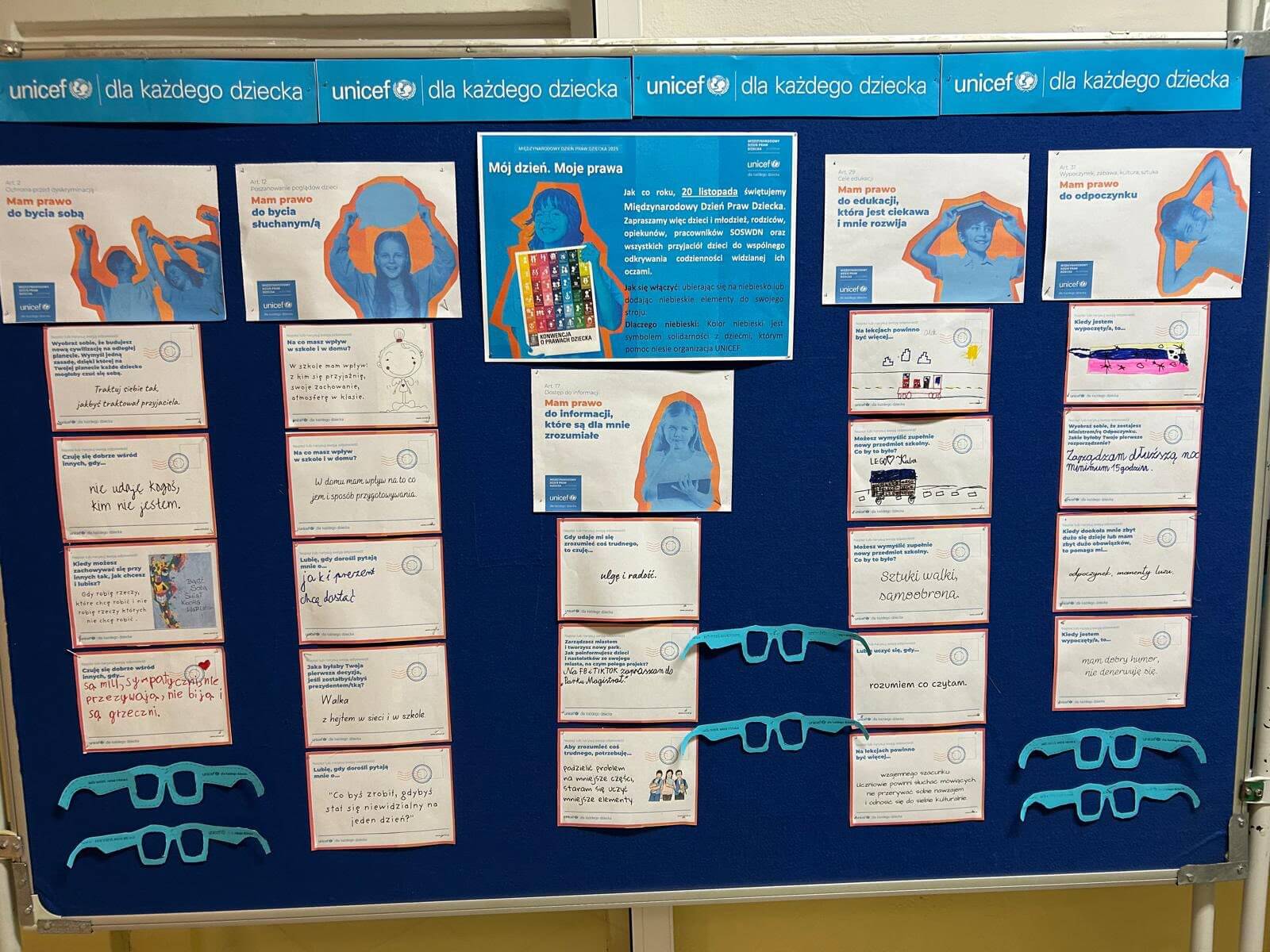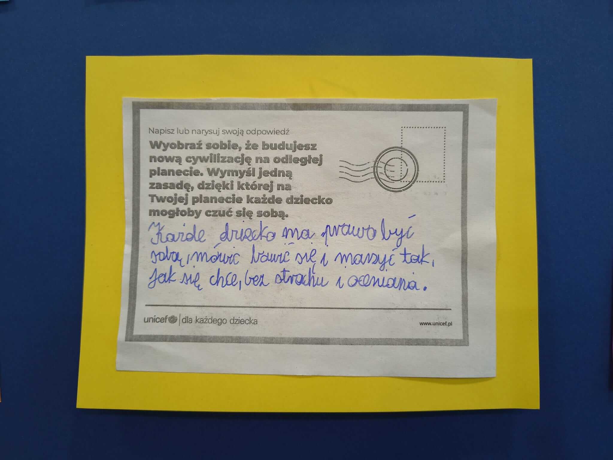 Chociaż w UNICEF Polska każdy dzień jest dniem praw dziecka, 20 listopada postanowiliśmy uczcić w naszym biurze w wyjątkowy sposób – ubierając się na niebiesko i patrząc na świat przez niebieskie okulary. Elementem świętowania był też tort ozdobiony hasłem „Mój dzień. Moje prawa”. Pojawiła się także galeria pocztówek przygotowana przez dzieci naszych pracowników, która pokazuje, jak one widzą i rozumieją swoje prawa.