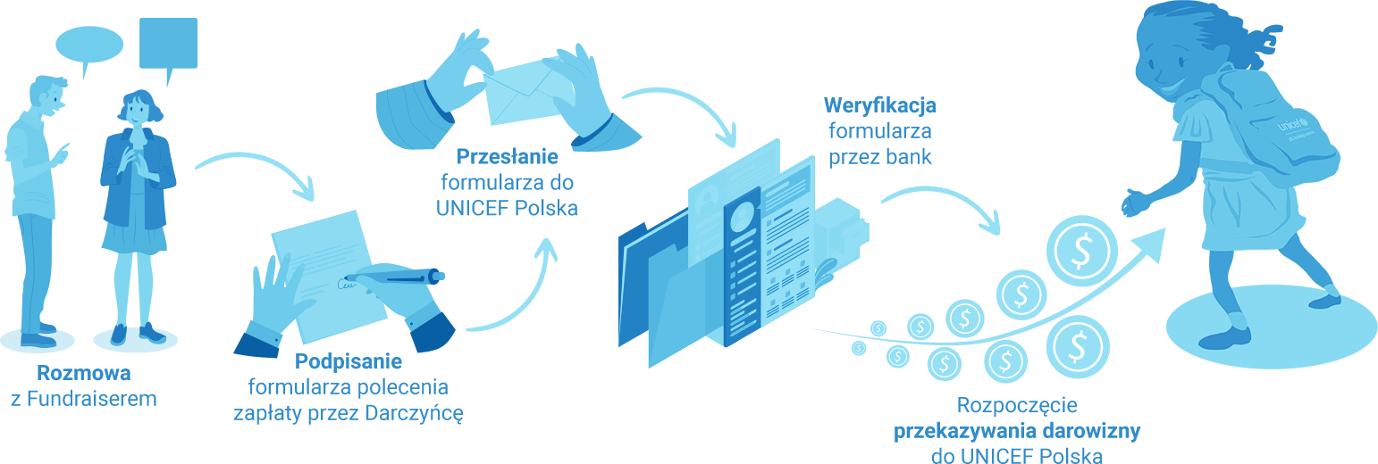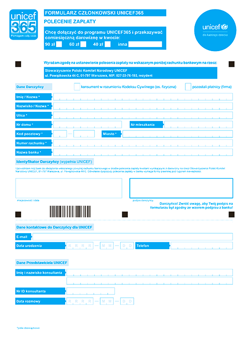 Polecenie zapłaty można uzupełnić z Fundraiserem UNICEF na żywo lub w trakcie rozmowy telefonicznej. W przypadku kontaktu telefonicznego – dokumenty niezbędne do uruchomienia polecenia zapłaty otrzymasz kurierem lub listem.